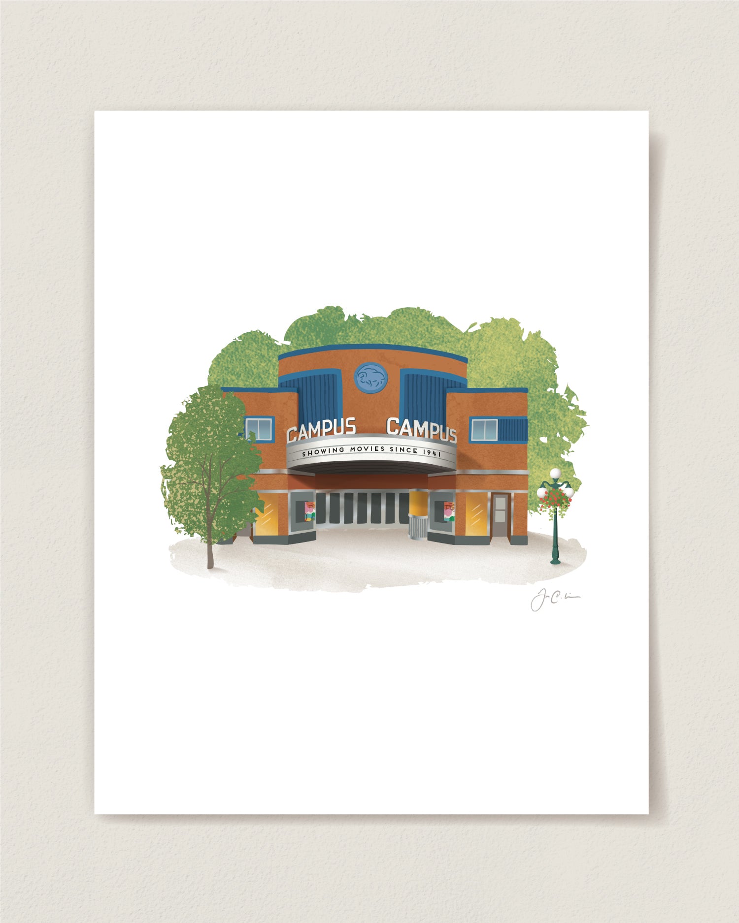An original illustration of the iconic, art deco Campus Theatre in the heart of Lewisburg, Pennsylvania. A perfect gift for anyone who has called this picturesque town home!