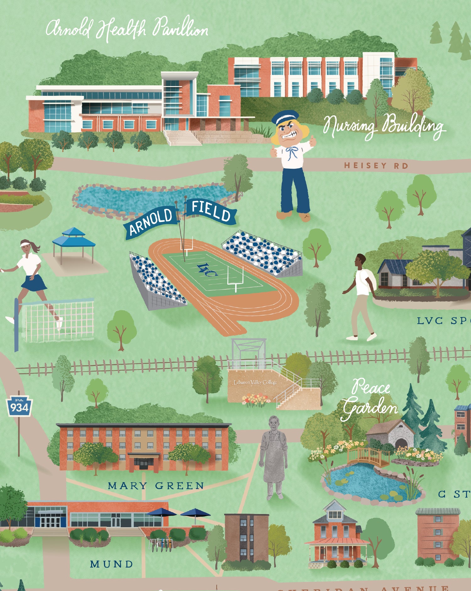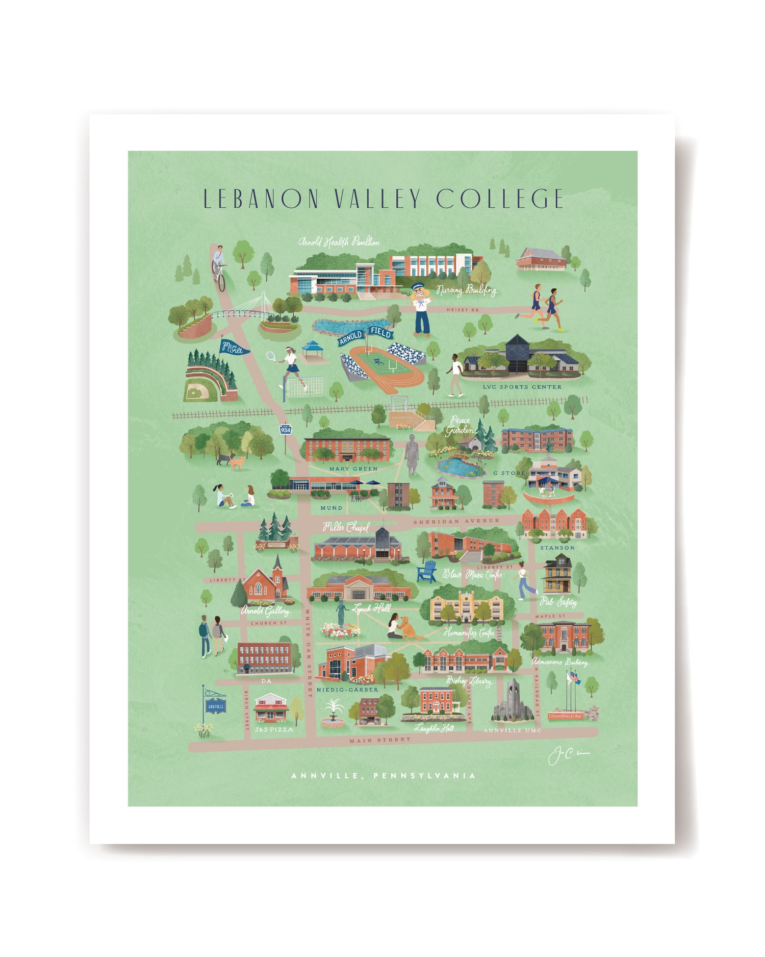 Go Dutchman! This original illustrated map of the Lebanon Valley College campus in Annville, PA is filled with wonderful details of the beautiful buildings and landmarks, making it an ideal gift. (Frame not included)