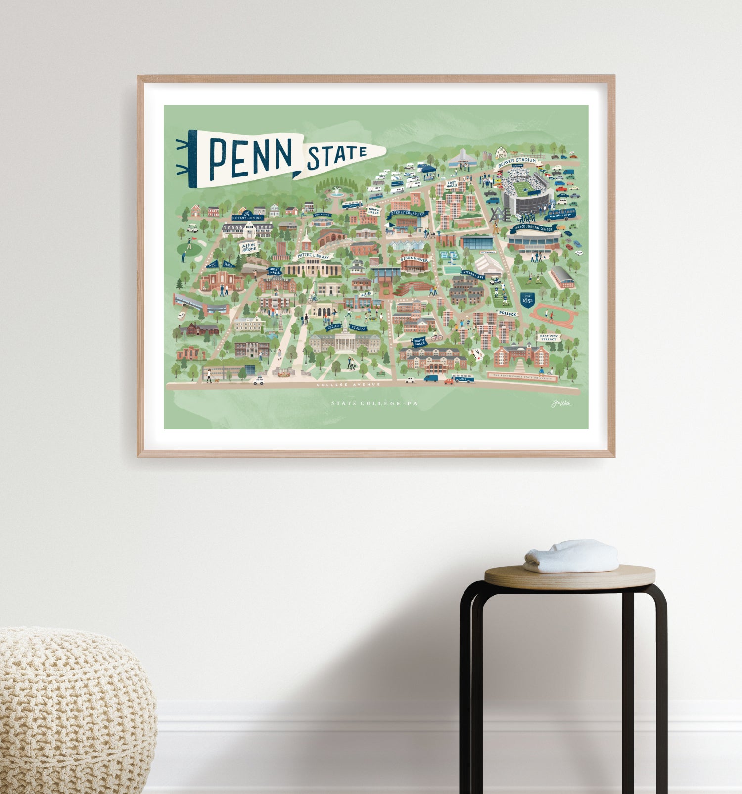 Professionally printed with archival quality inks on light weight matte paper. The art quality print can be found here: https://jwickdesign.com/products/penn-state-illustrated-map-print