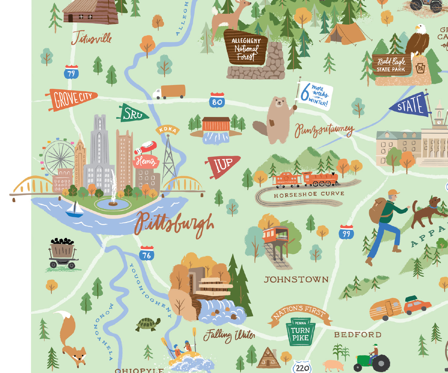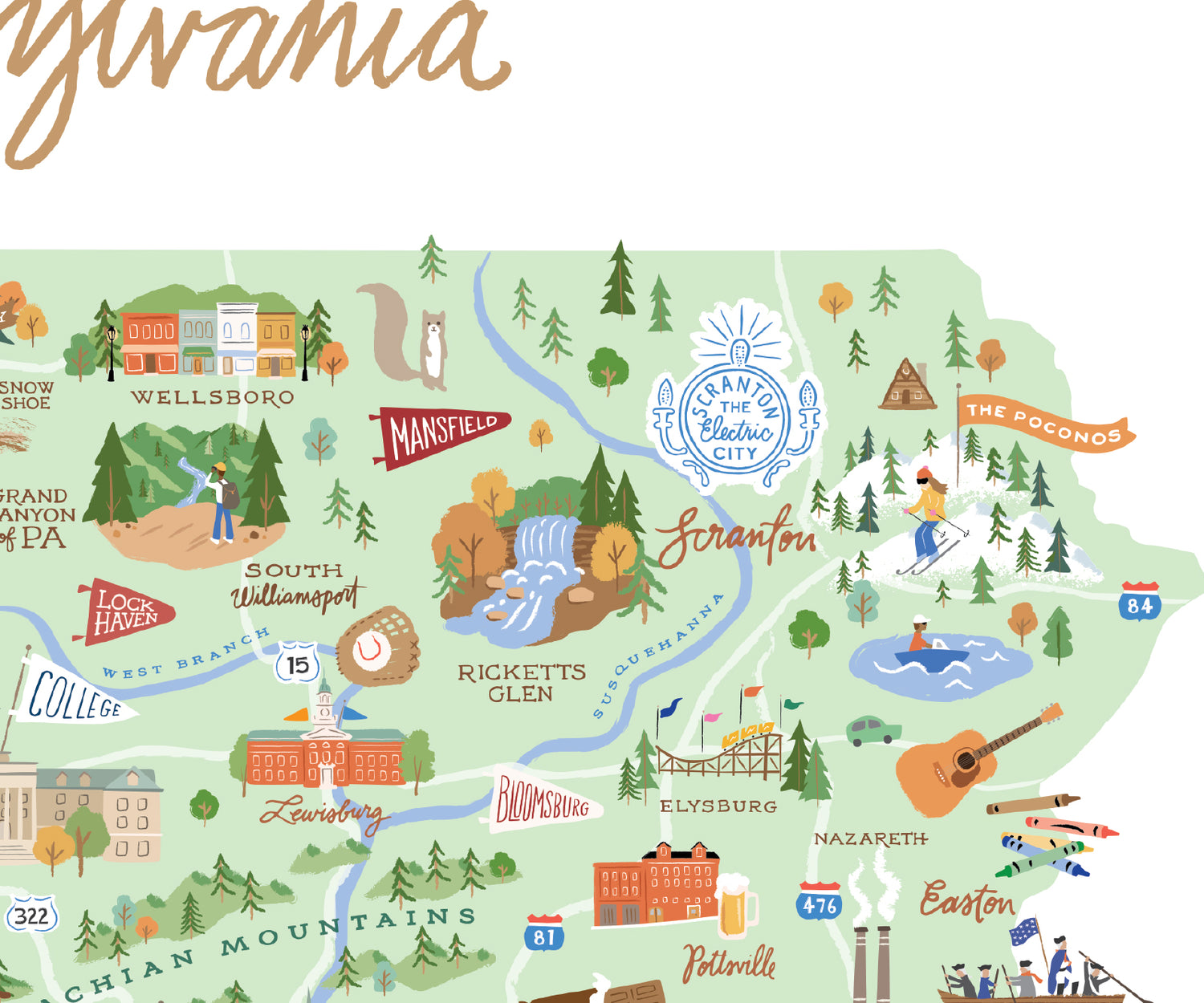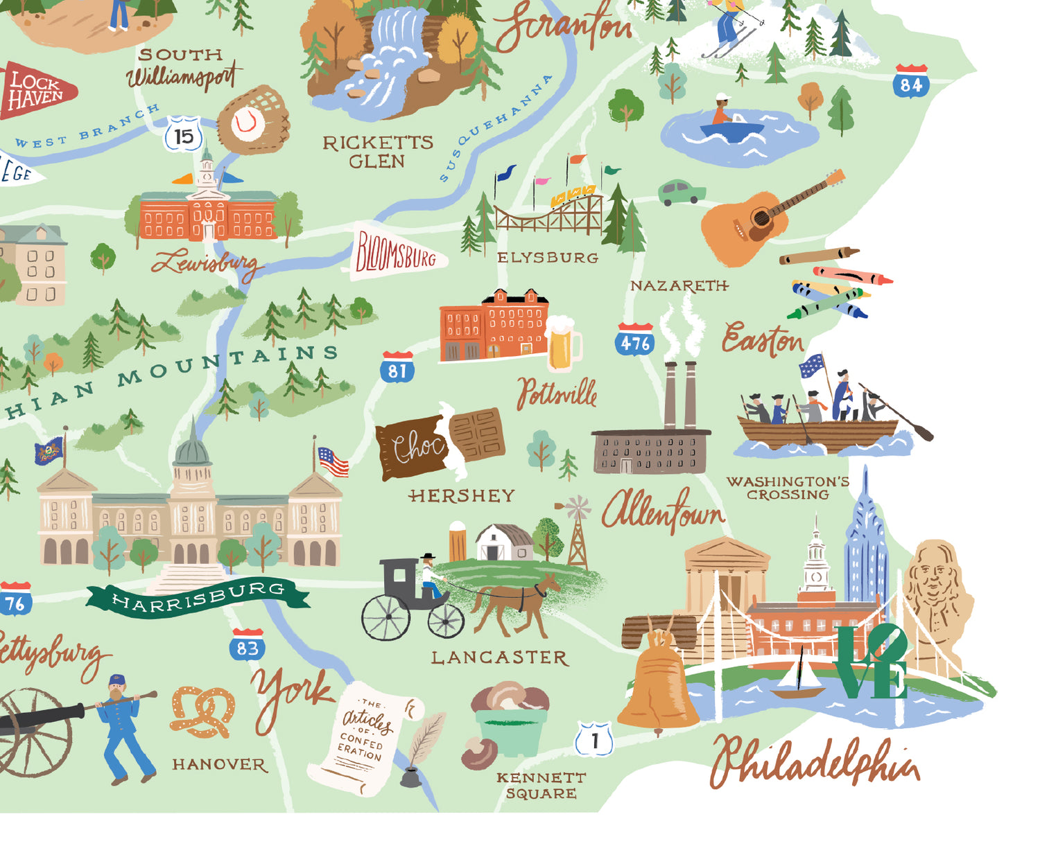 Celebrate all things Pennsylvania with this beautifully illustrated map of the Keystone state. The original illustration features the great cities of Philadelphia and Pittsburgh, tons of historical sites (Gettysburg and Washington's Crossing) and firsts (first capital, first turnpike, first radio station, first beer distillery) and beautiful scenic places like Ricketts Glen and the Grand Canyon of PA. This beautiful print makes a great gift for everyone who calls PA home or just loves the state! (Frame not included)