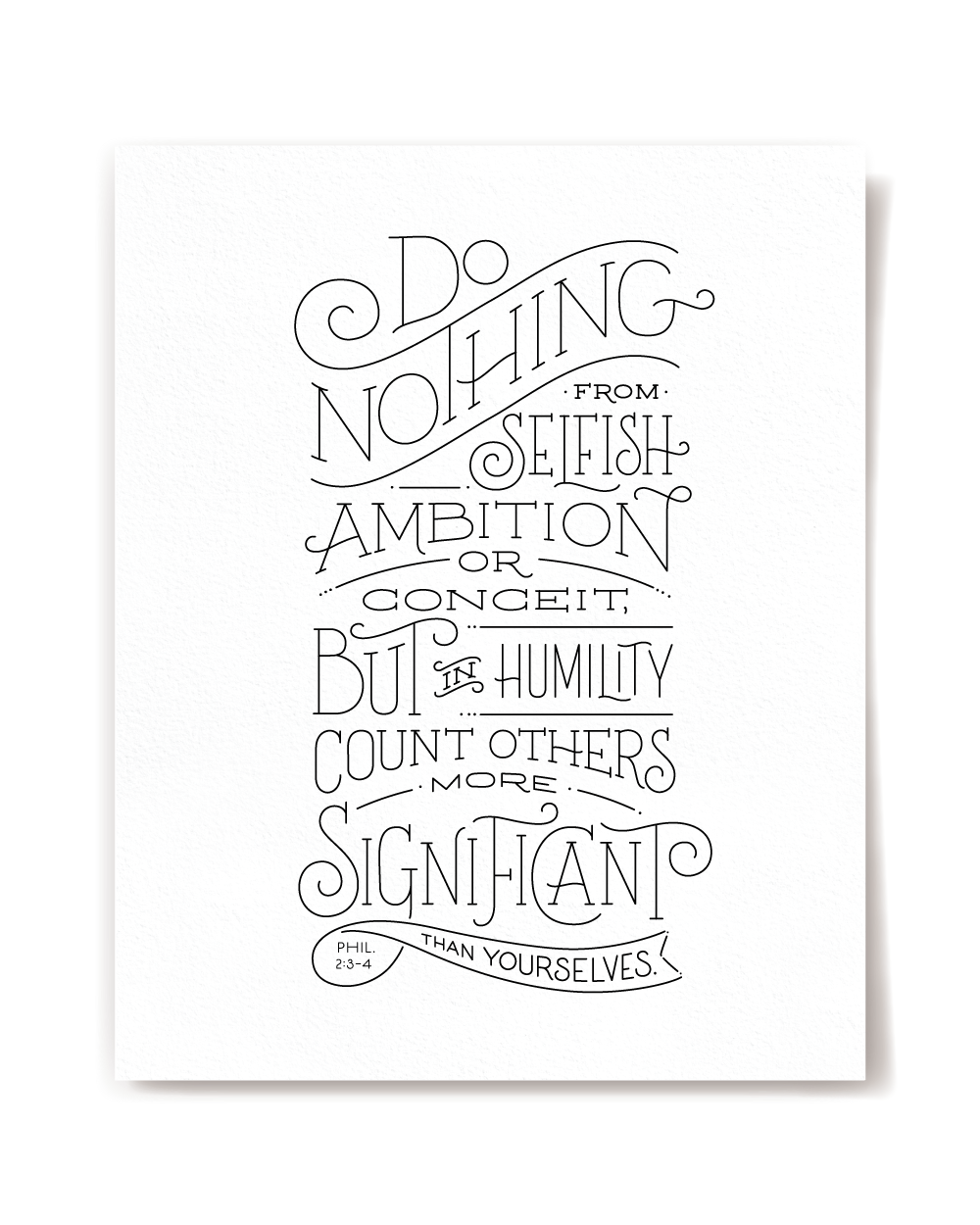 A thoughtful, custom lettered print featuring the passage from Phillipians 2:3-4.